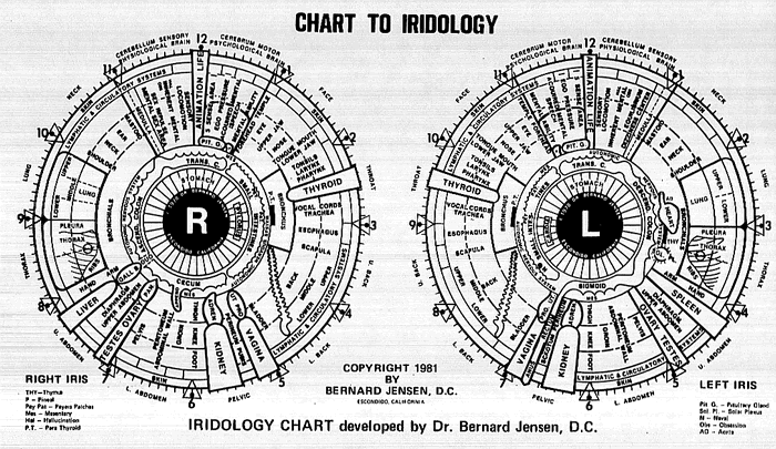 Bernard Jensen (americano) desenvolveu um mapa de iridologia onde nele est indicada a posio relativa de cada rgo representado na ris. A ris direita representa os rgos que esto localizados do lado direito do corpo e a íris esquerda os que esto localizados do lado esquerdo. Por exemplo: o fgado est representado na ris direita, o bao na ris esquerda. J a tireide est representada nas duas ris. |